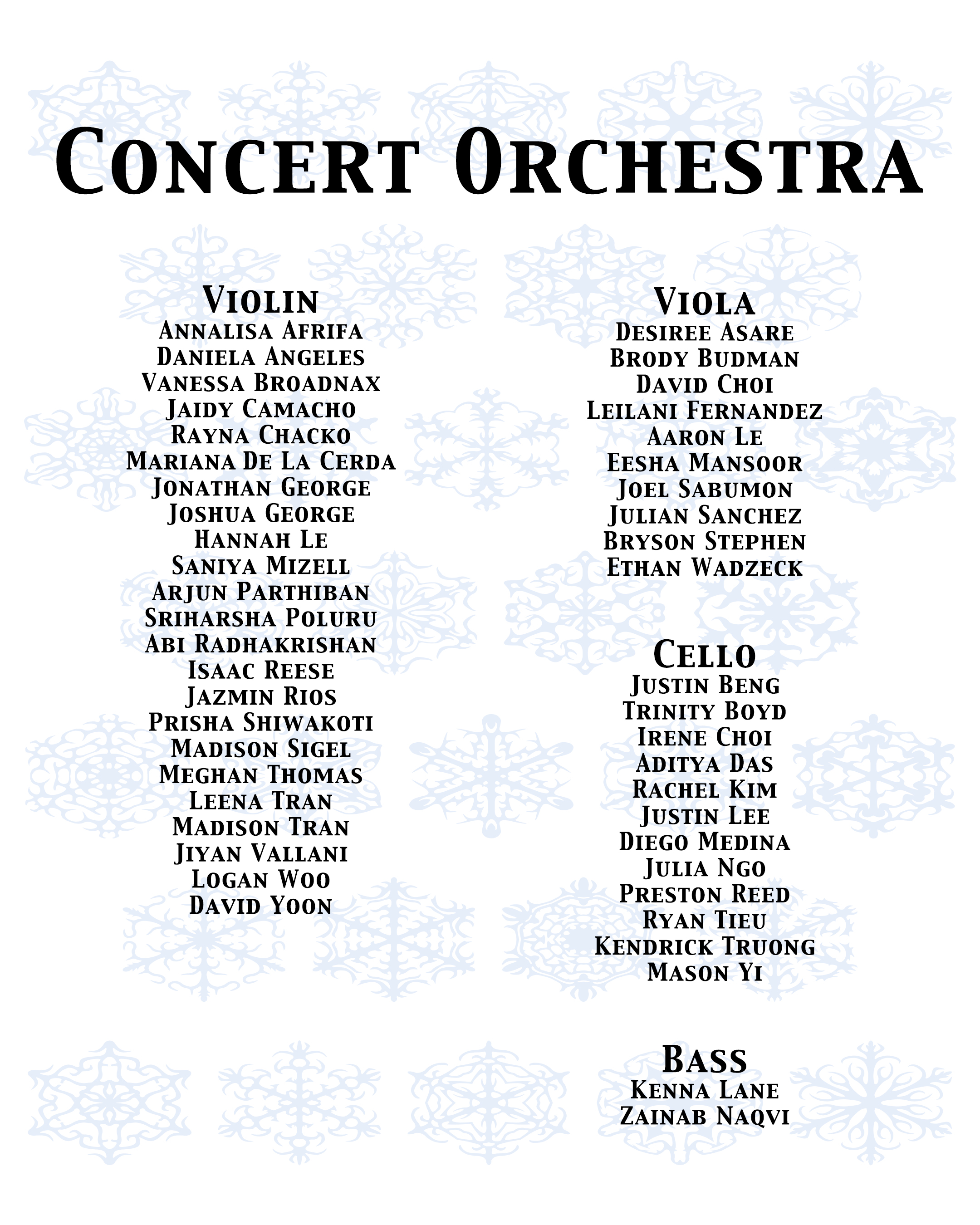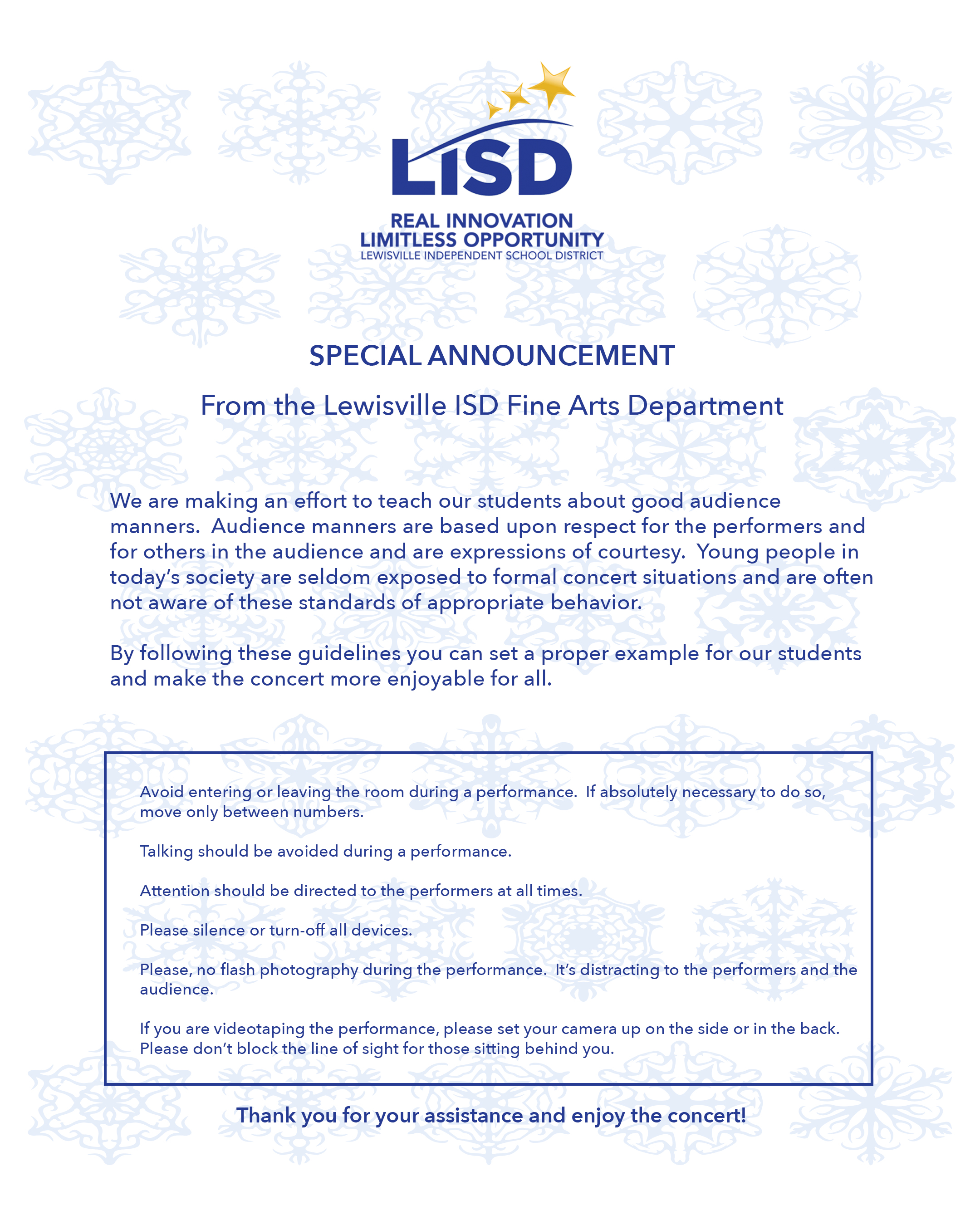 We are excited to share our UIL programs with you all tonight at our Midwinter Concert. The program will be announced from the stage. Please help us have a great concert by observing the following concert etiquette guidelines: