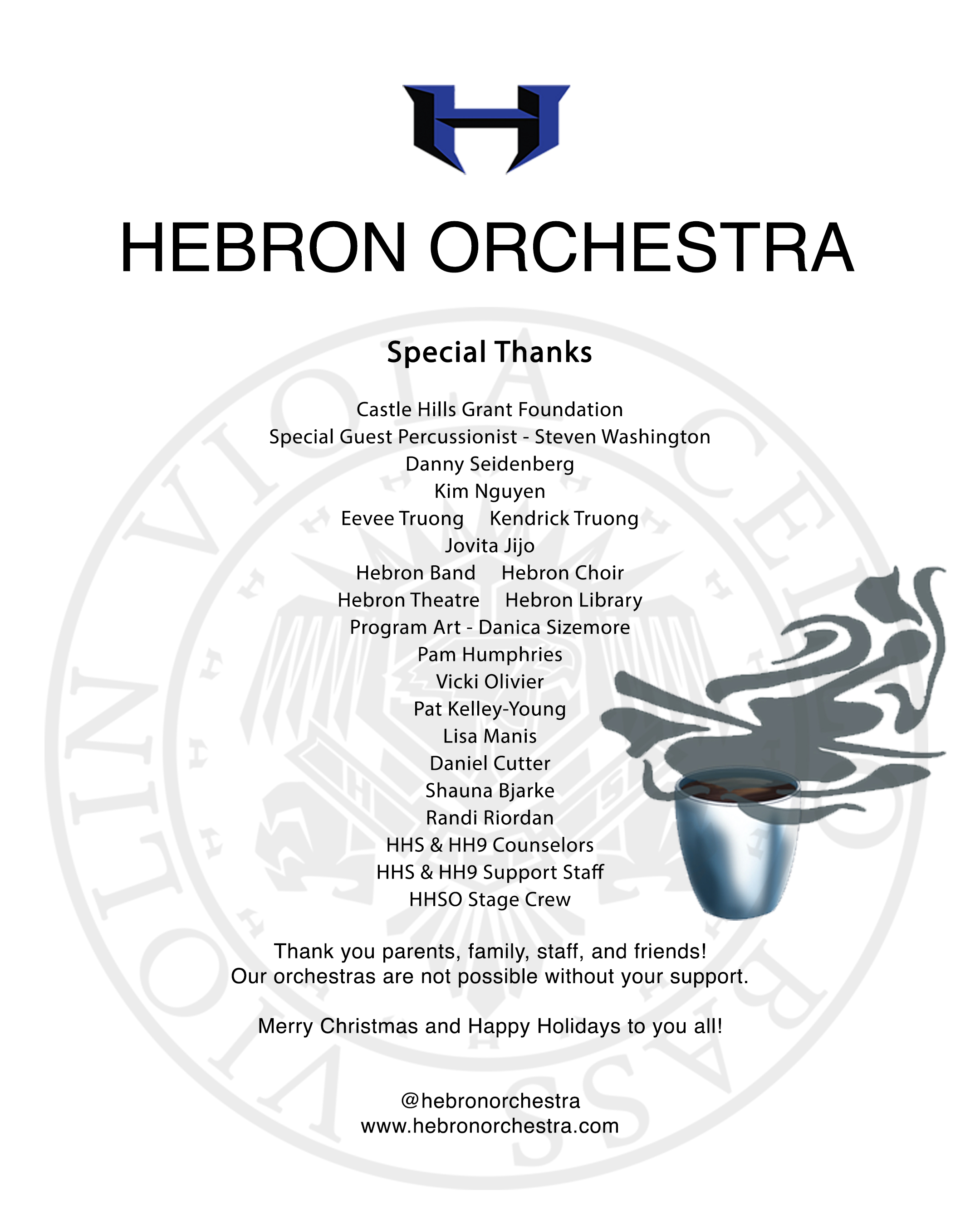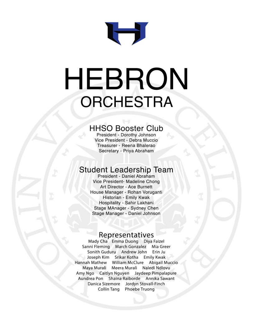 The Hebron Open House is next Wednesday. There will be a PTSA meeting at 6:00pm in the cafeteria, and then parents will follow their students’ class schedule. Our Chamber Orchestra will be performing on the 2nd floor landing of the main campus hallway during passing periods, so please visit us there. We will not be in the orchestra room.
