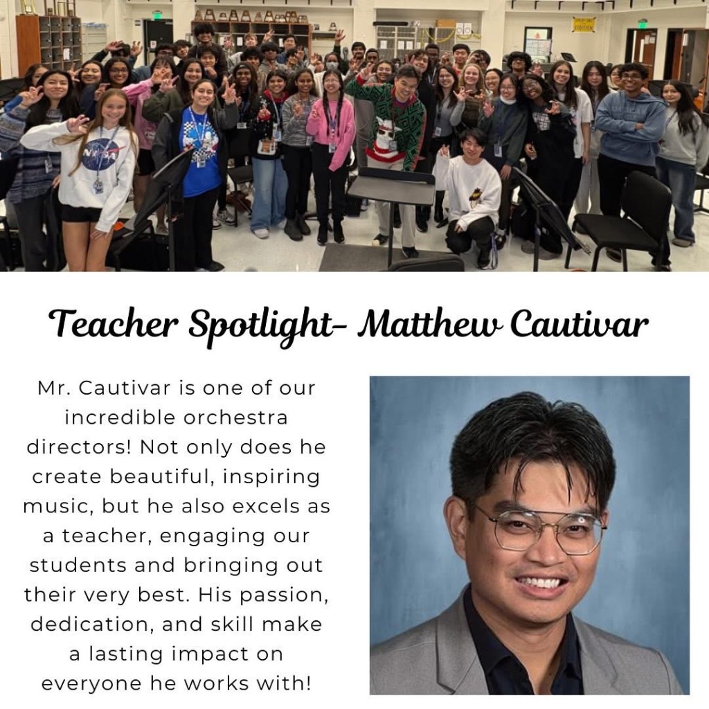 Mr. Cautivar enjoys several genres of music, and even more – sharing the joy of music with students. In his free time he enjoys cooking and dining, watching and playing basketball, and taking his newly adopted pitbull Turtle Latte on runs at the lake.